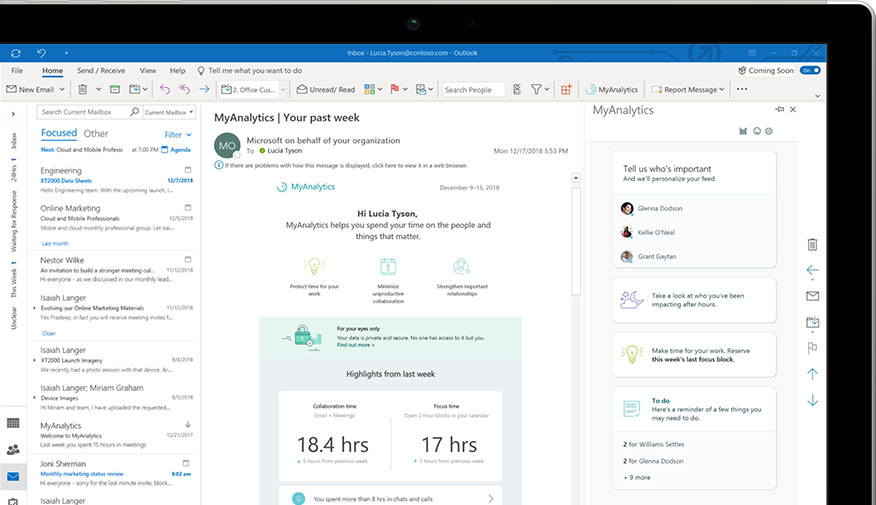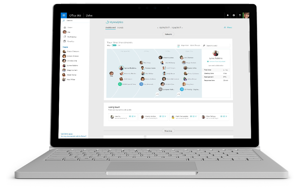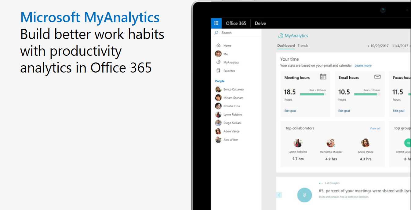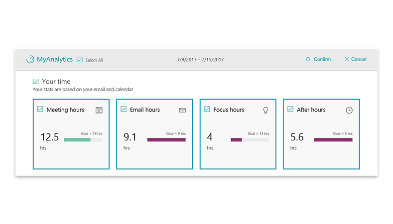 MyAnalytics summarizes how you spend your time at work, then suggests ways to work smarter – from cutting unproductive meeting time to getting better work/life balance.
