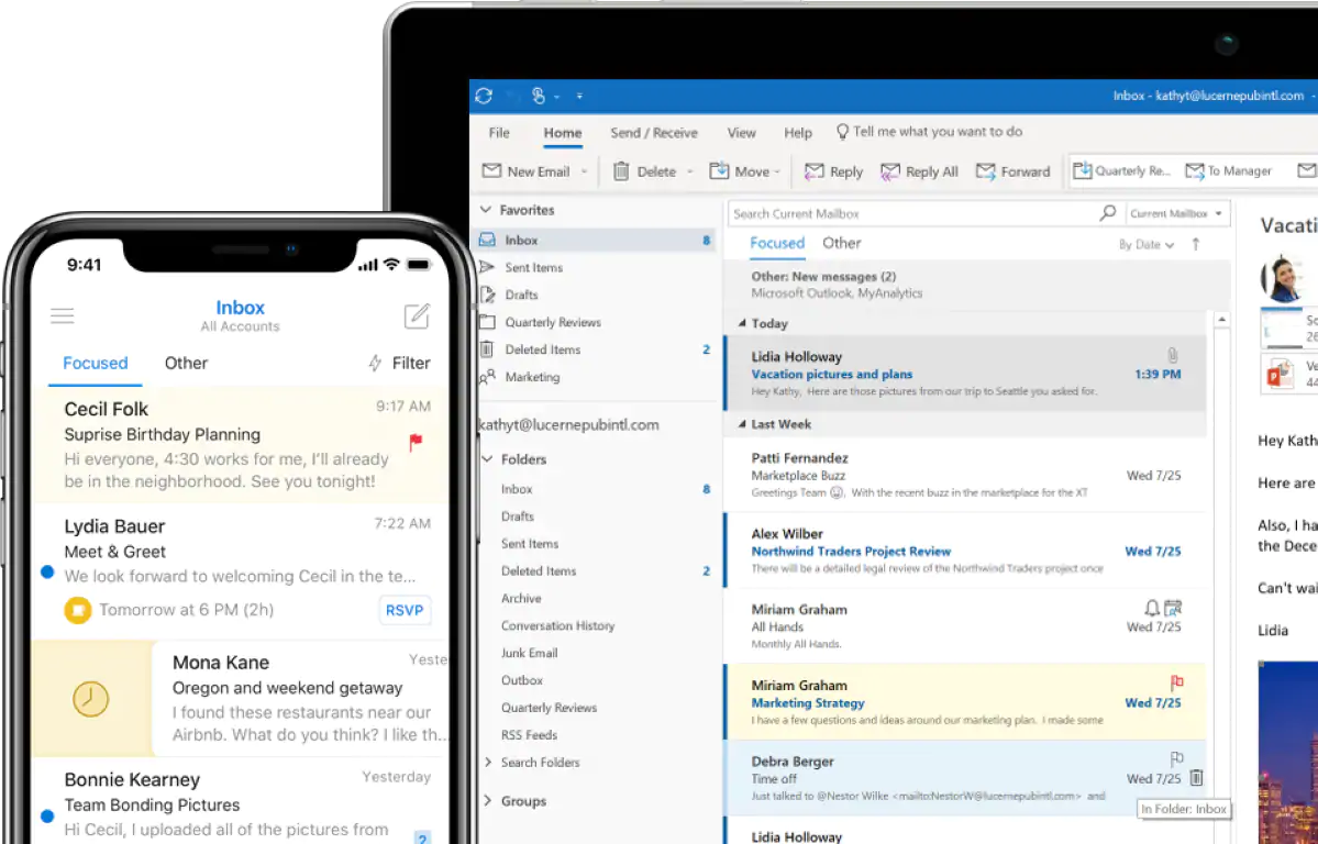 Outlook anticipates your needs. Travel and bill payments are automatically added to your calendar, and intelligent reminders help keep you on track. Search helps you find information quickly.